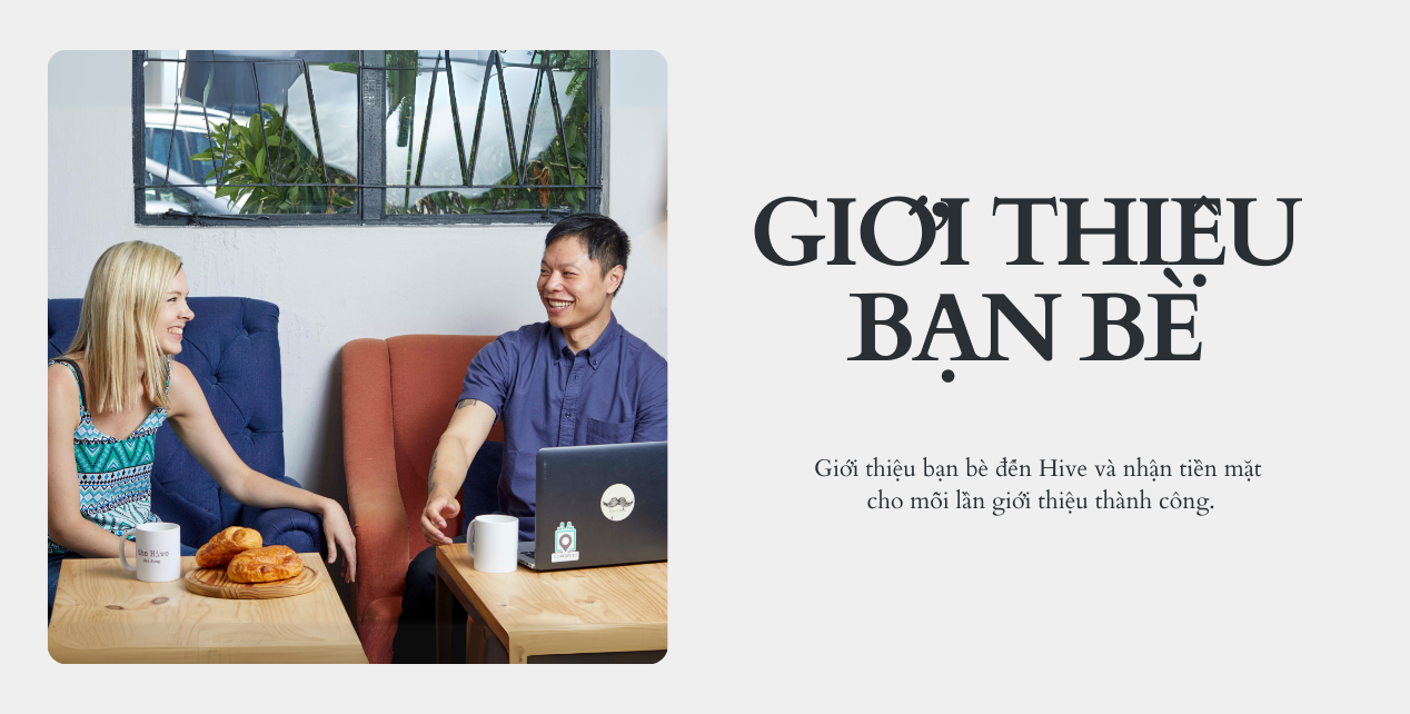 Giới thiệu bạn bè cùng gia nhập cộng đồng the Hive và nhận ngay khoản tiền thưởng tương đương cho mỗi đăng ký thành công. Ưu đãi áp dụng cho tất cả gói thành viên bao gồm Bàn linh hoạt, Bàn cố định và Văn phòng riêng